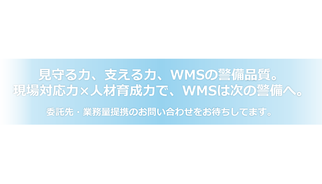 施設警備・交通誘導警備・雑踏警備など、1号警備から3号警備まで幅広く対応し、現場の状況に応じた最適な体制を構築しています。私たちの使命は、単に安全を守ることではなく、“信頼される存在”として地域社会に貢献すること。警備員一人ひとりが高い意識と責任感を持ち、日々の業務に臨んでいます。教育・訓練を徹底し、経験豊富な人材が迅速かつ丁寧に対応することで、企業・施設・地域の皆さまに「安心を任せられる会社」であり続けます。人を想い、街を守る。WMSは、これからも安全の未来を見据え、確かな警備品質を提供してまいります。